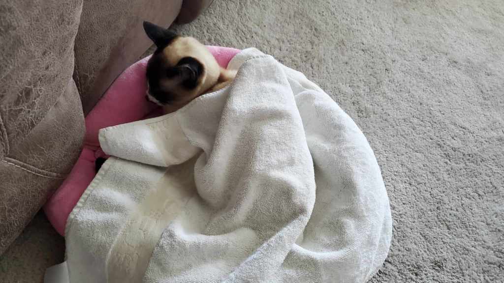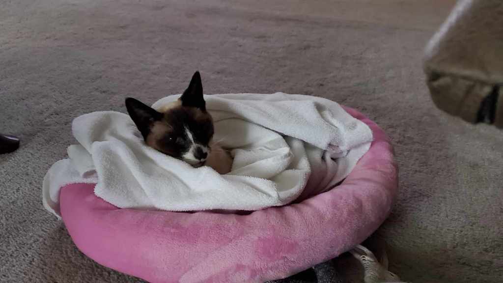 Three days ago we began spending the night with him. He laid on the floor over a heat duct in order to keep warm. I brought over Cleo’s pink princess bed so he could have a nice cushion to lay on. He was either in our arms or over the vent in his bed. He had lost the ability to move more than his head and shoulders.